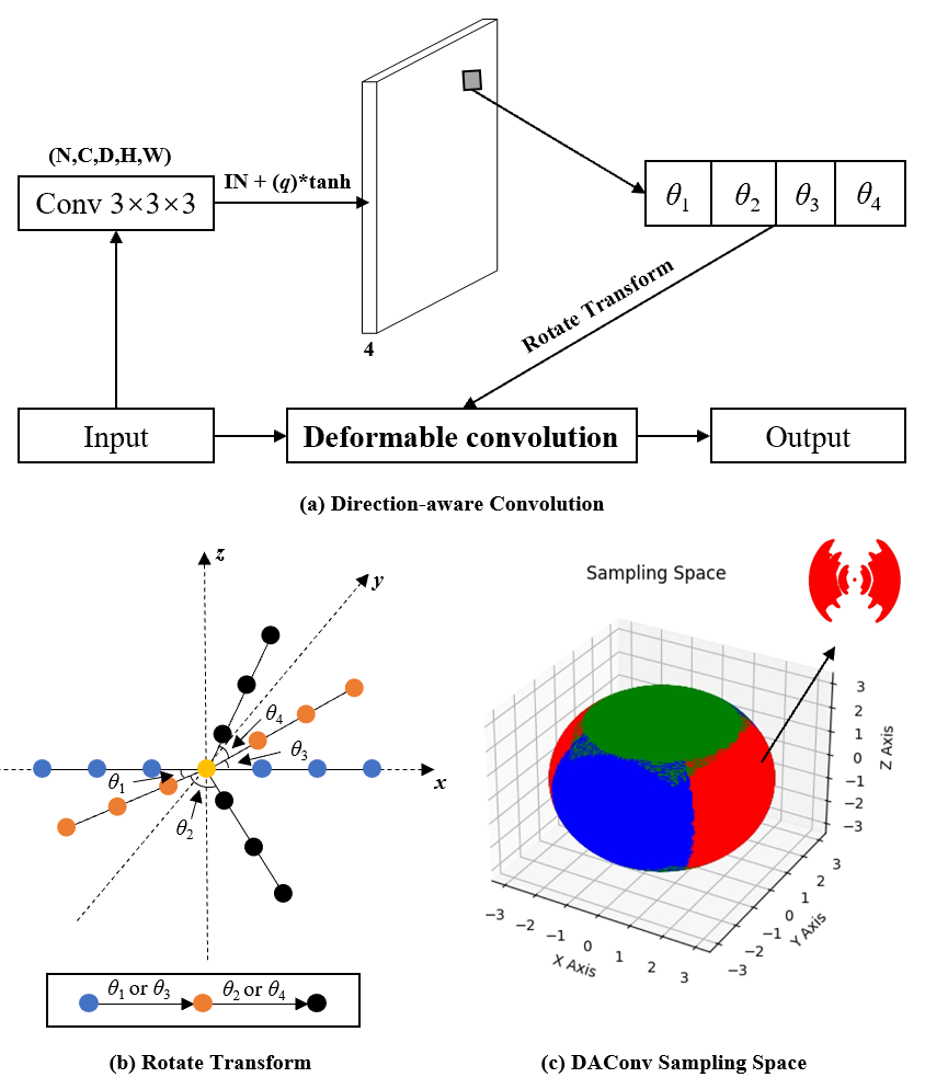 為了解決該問題,研究團隊創新性提出了“方向感知卷積”的概念,該創新的理念始于可變形卷積和氣道獨特的樹形結構,通過旋轉變換和位置偏移,改變傳統卷積核的形狀,使得卷積核的形狀適應氣道細長的結構,促使氣道提取網絡獲得更多有效的氣道管狀特征,從特征增強的角度解決氣道漏檢和過分割的傳統問題。該成果在最大的肺部氣道分割數據集ATM22和最大的纖維化肺部氣道分割數據集AIIB23取得了最優的平均性能指標,分別為94.95%和89.70%。在ATM22數據集中,氣道樹長和分支檢測率達到了95.34%和93.39%,在AIIB23數據集中,實現了95.50%和95.76%的氣道分割精度和泄露控制率,展現了世界領先的氣道提取連續性能和準確性能。