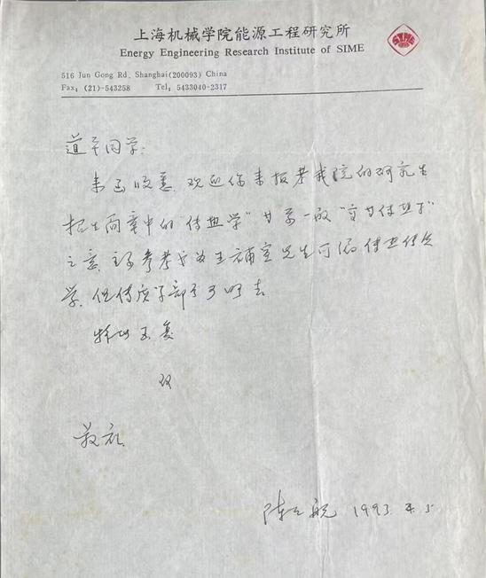 對素未謀面的學生,陳教授也傾注真心。上海理工大學原黨委副書記劉道平1993年準備報考他的博士,因不確定“傳熱學”參考書目,忐忑寫信咨詢。沒多久便收到陳教授親筆回信:“道平同學:來函收悉,歡迎你來報考我院的研究生。招生簡章中的‘傳熱學’等系一般‘高等傳熱學’之意,主要參考書為王補宣先生所編‘傳熱傳質學’,但傳質學部分可略去。特此函復,致敬禮。陳之航,1993年4月5日?!眲⒌榔奖硎荆骸岸潭處仔凶郑冉饬宋业囊蓡?,更讓我感受到老教授的鼓勵?!笨既£惤淌谘芯可螅S他參加國際會議、走訪企業,深知其在熱能工程領域的國際影響力,也深受陳教授為師之道的影響。?