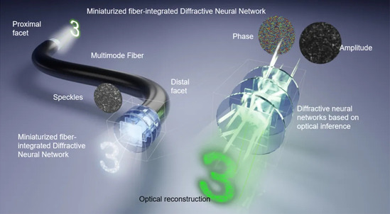 2月7日,國際頂級期刊《自然·光子學(xué)》(Nature Photonics)在線發(fā)表了上海理工大學(xué)智能科技學(xué)院顧敏院士、張啟明教授團(tuán)隊(duì)的一項(xiàng)突破性研究成果。該團(tuán)隊(duì)通過創(chuàng)新性將微型光學(xué)衍射神經(jīng)網(wǎng)絡(luò)(Diffractive Neural Networks, DN2s)與多模光纖集成,成功實(shí)現(xiàn)全光實(shí)時(shí)圖像傳輸技術(shù),為醫(yī)學(xué)內(nèi)窺鏡成像與下一代光通信系統(tǒng)提供了革命性解決方案。論文第一作者為蔚浩義特聘副教授。“傳統(tǒng)多模光纖因模式耦合易受彎折干擾,導(dǎo)致信號失真,如同透過毛玻璃看世界。”張啟明教授解釋,“我們的光學(xué)神經(jīng)網(wǎng)絡(luò)就像在光纖末端安裝了一臺‘智能顯微鏡’,實(shí)時(shí)糾正畸變,還原清晰信息流。”蔚浩義表示“我們采用3D雙光子納米光刻技術(shù),在直徑不足0.1毫米的多模光纖端面精準(zhǔn)制造出多層微型光學(xué)衍射神經(jīng)網(wǎng)絡(luò)。”這一結(jié)構(gòu)可直接在可見光波段對傳輸中的散斑圖案進(jìn)行振幅與相位信息的實(shí)時(shí)解析,無需傳統(tǒng)AI技術(shù)所需的“光-電-算”轉(zhuǎn)換步驟,首次實(shí)現(xiàn)了多模光纖內(nèi)光信號的全光學(xué)智能處理。微型光纖圖像傳輸技術(shù)能夠直接應(yīng)用于光纖內(nèi)窺鏡支持的精準(zhǔn)醫(yī)療、微創(chuàng)腦神經(jīng)細(xì)胞的實(shí)時(shí)成像研究,為生物醫(yī)學(xué)領(lǐng)域提供一個(gè)前所未有的技術(shù)平臺。同時(shí),因